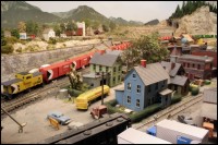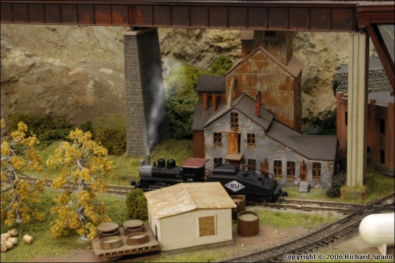 Image 1-16. S&U 0-4-0 116 is ready to pick up a Heinz vinegar car on the siding behind the freshly painted pickle works in Undecided. The abandoned grain mill tucked under a span of the John Allen Memorial Viaduct was scratchbuilt by David K. Smith when he was a teenager. Despite the oversized window mullions, his wonderful creative artistic talents were very evident to me and I wanted to preserve the personal history between us. |