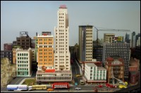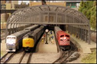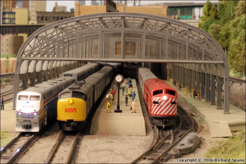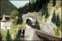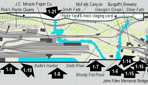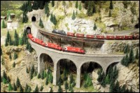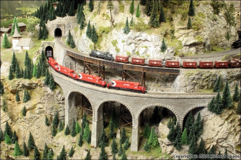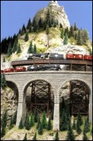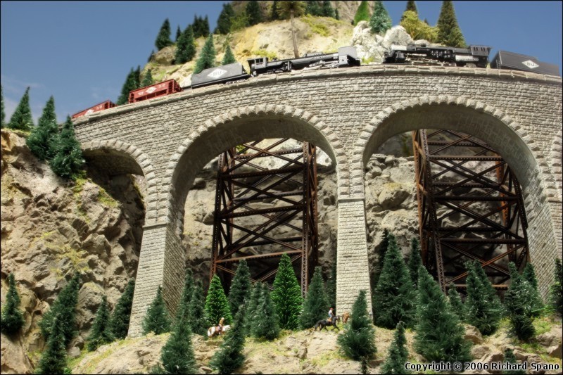 Image 1-11. Not really a cornfield meet! The two S&U locos are on separate tracks. The heavy Pacific is on the high line steel trestle and the elephant-eared loco is on the stone arch viaduct. |