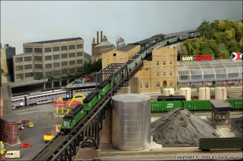Image 1-4. While Amtrak passengers board the Empire Builder on the lower level of Union Station in Multi-City, a BN coal train passes through the upper level of the station and over Port Allen in the foreground. |