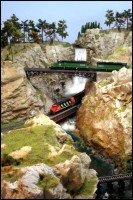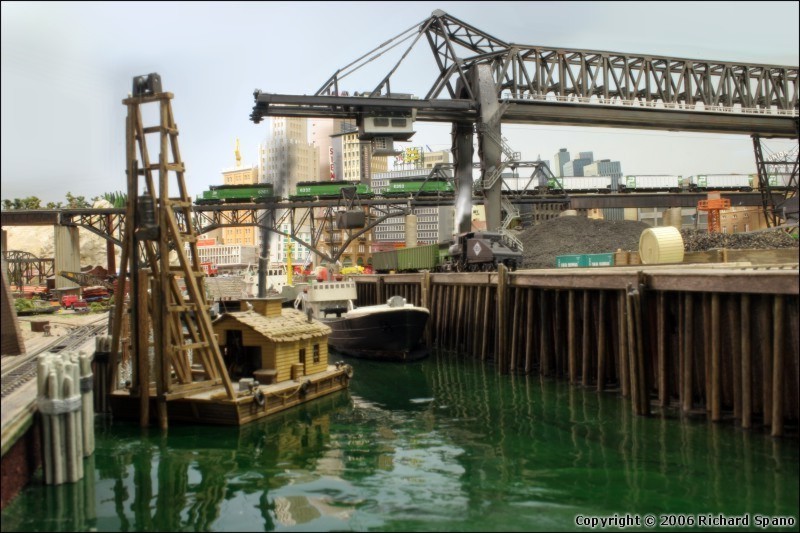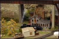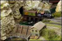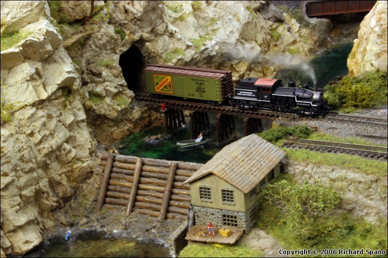 Image 1-14. A well-kept shay rumbles across a short trestle on its way into Undecided, while a pair of fishermen try their luck below. The fellow in the lower left corner of the photo appears to have caught something, as his rod jerks up and down. See the fisherman in action. |