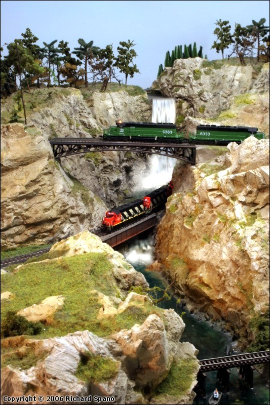 Image 1-6. BN coal train crossing a CN grain train at George's Gorge, with Bloody Fist River in the foreground and Silver Falls in the background. |