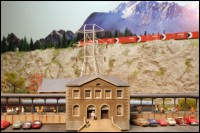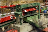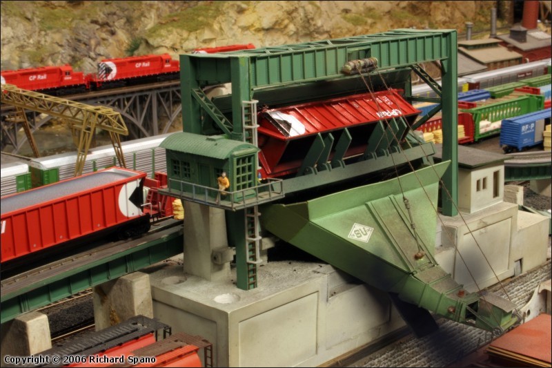 Image 1-18. An early CP Rail coal bath tub gon is unloaded by S&U Rota Tilt car dumper at Anachron Yard. It won't be long before that pretty Action Red paint scheme becomes blackened by the coal dust. See the dumper in action. |