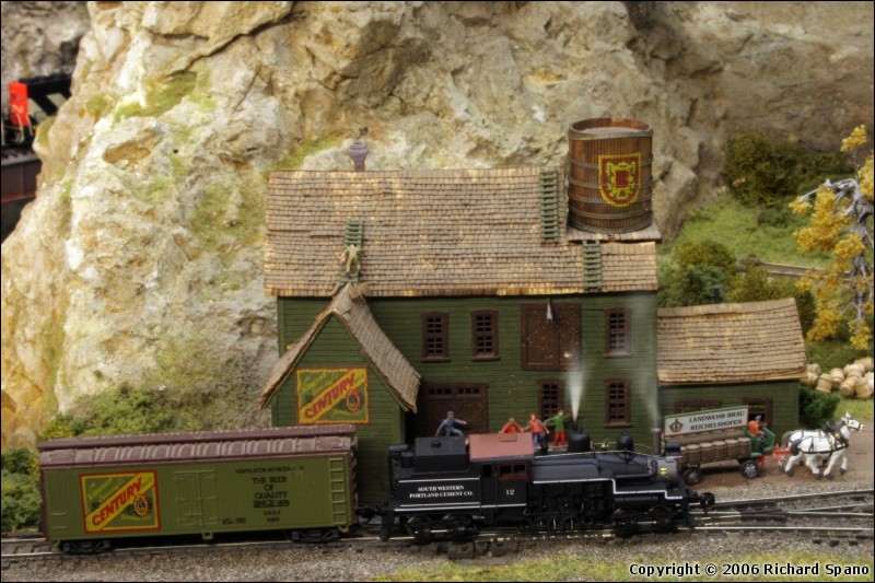 Image 1-15. The shay pulls up to the Burgoff's Brewery and announces its arrival with a blast of its whistle. A bunch of fellows on the loading dock appear to be having a blast of their own. |