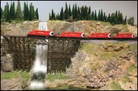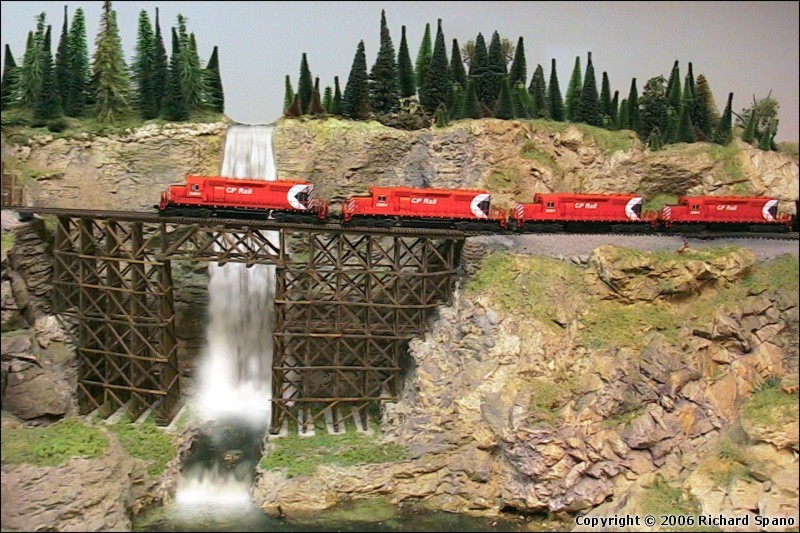 Image 1-8. CP Rail SD40-2's cross the wooden trestle at Smith Falls on their way unload their train of coal cars at the rotary car dumper in Anachron yard. |