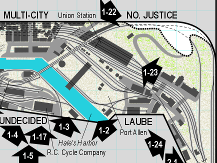 Image 1-2. Operating pile driver and bridge crane in Port Allen with Multi-City in the background. A loaded BN coal train heads west to Anachron Yard rotary car dumper. See the pile driver in action. |
